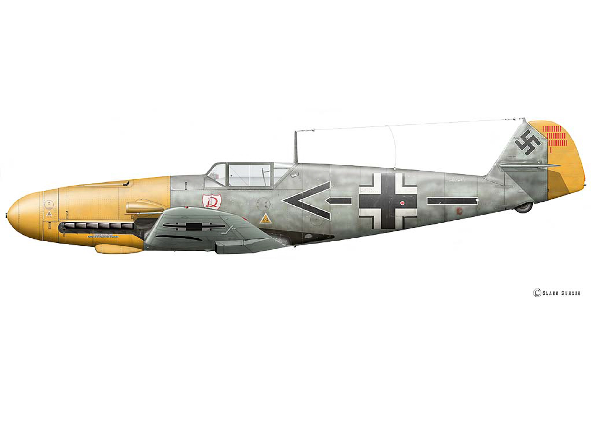 A Messerschmitt Bf 109F-2 from the Wing Headquarters Flight, 2nd Luftwaffe Fighter Wing (Stab./JG 2) designated as “Black Chevron Bar” (W.Nr. 5749). This aircraft was flown by Hauptmann Wilhelm Balthasar. Balthasar had more than 45 aerial victories before he was shot down by a Spitfire on February 16th, 1941. Artwork by Claes Sundin.